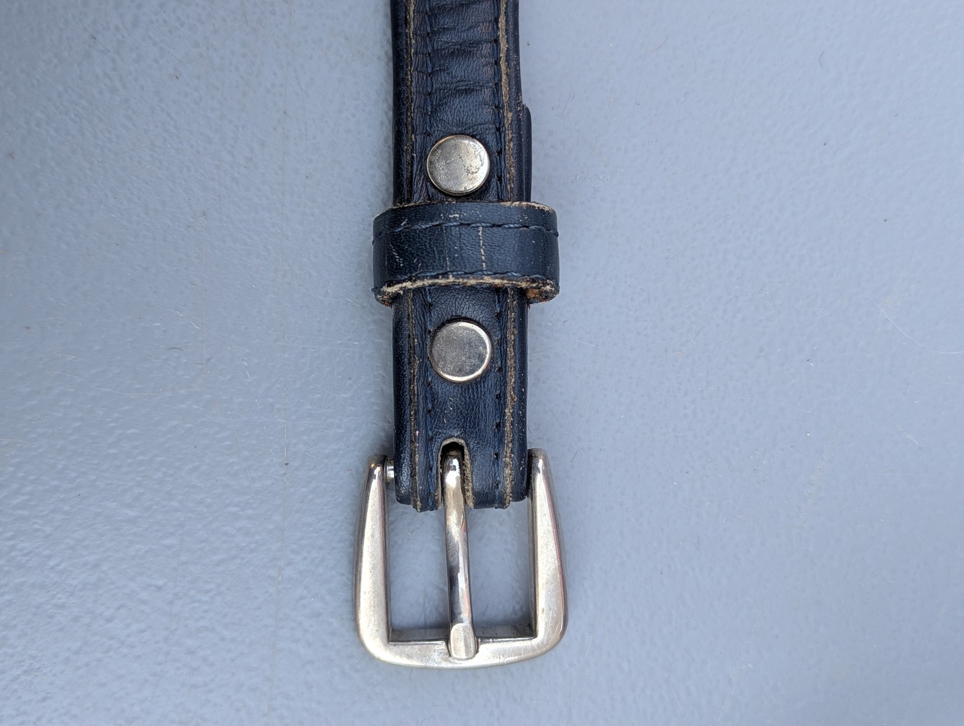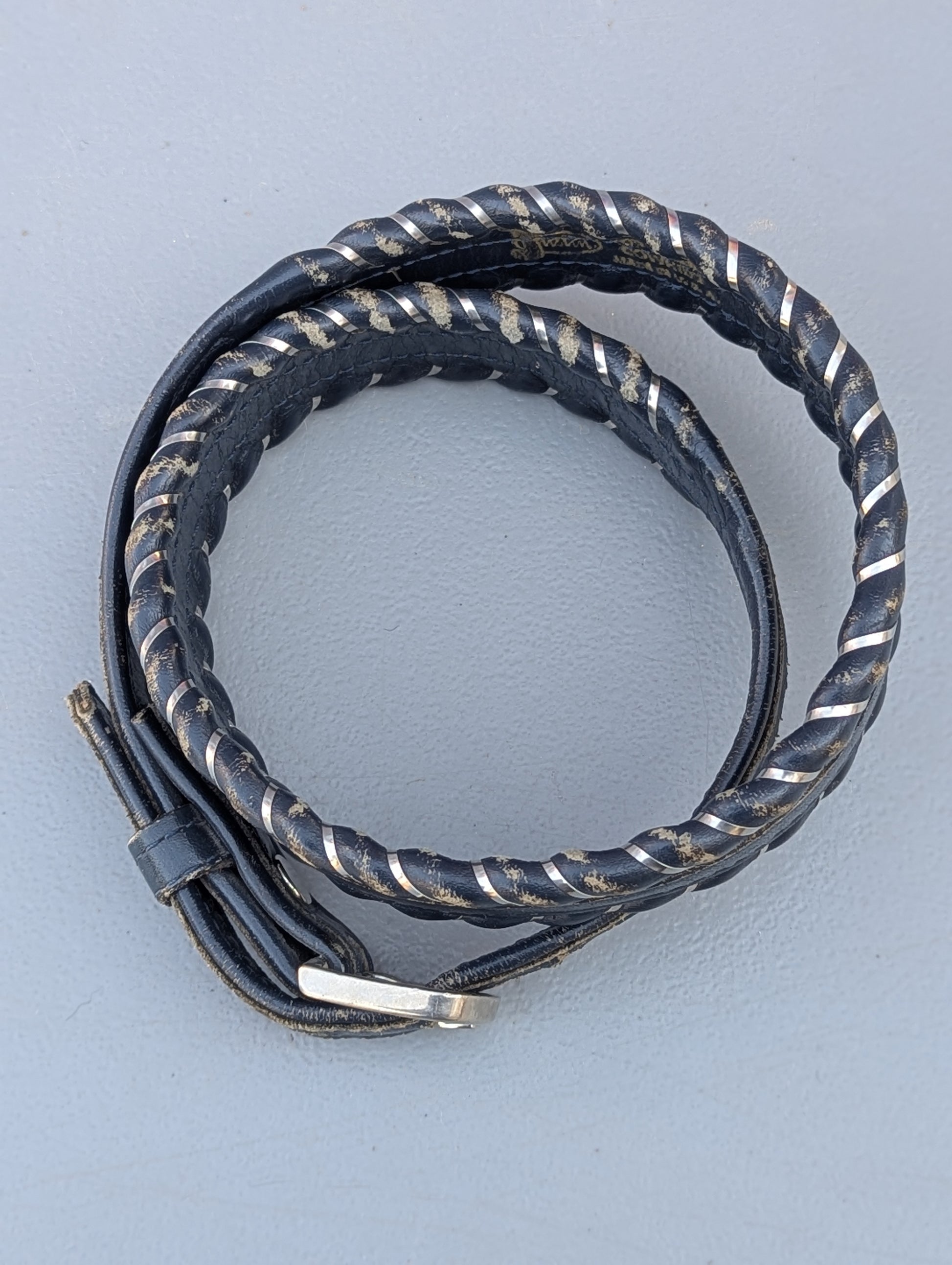 Dark blue leather and silver woven edge detail with silver buckle.