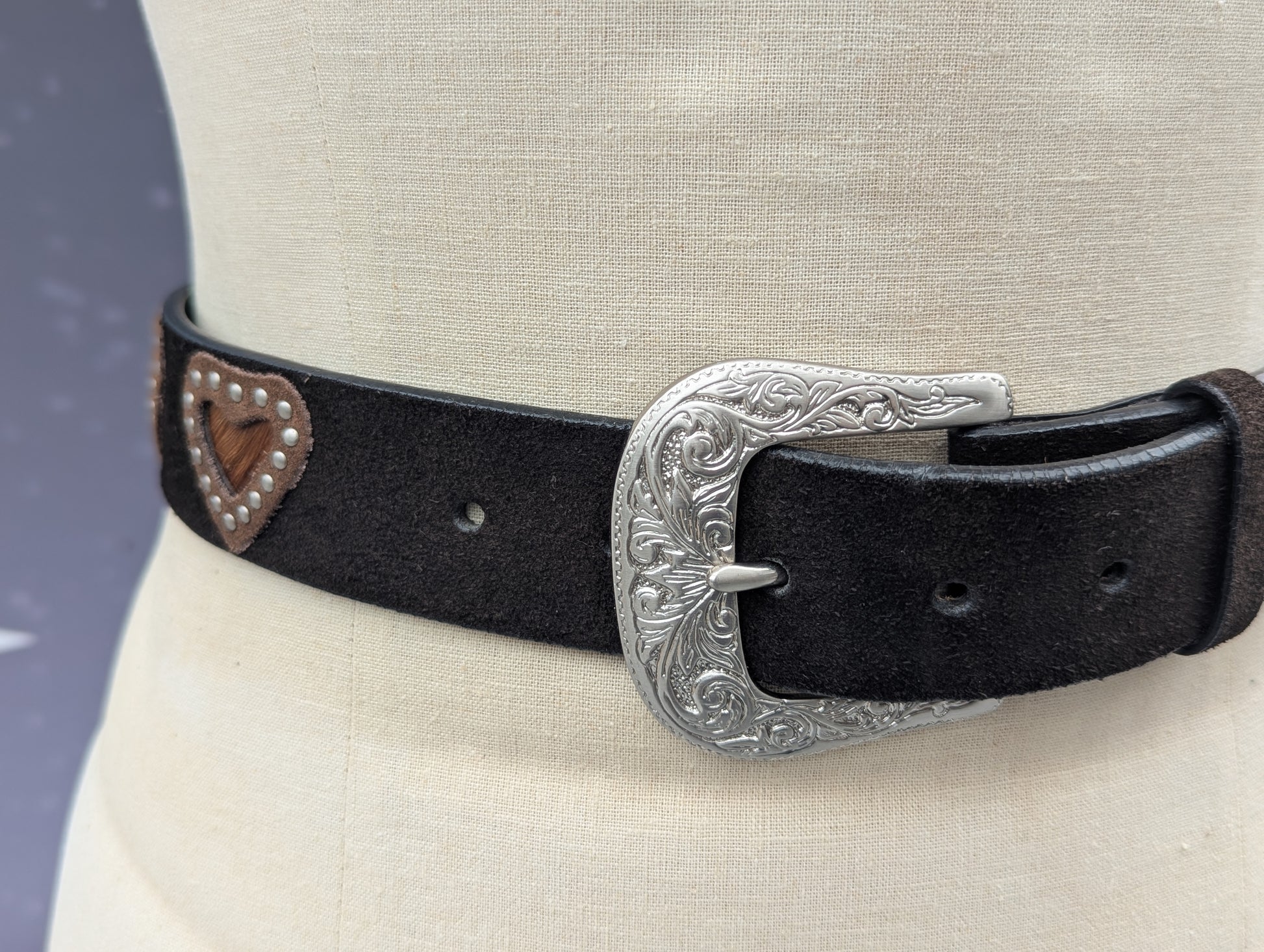 Top grain leather with studded hearts and silver buckle.